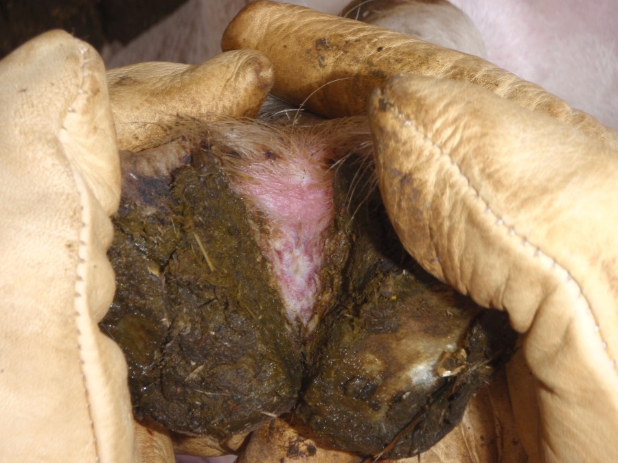 Figure 5. Score 2. Lesion with dry necrotic exudate and ridging of the axial wall of each digit. There is evidence of previous underrunning on both digits. The underrun pockets of healed lesions can harbour viable D. nodosus, as they provide a suitable anaerobic environment. This can lead to future breakdowns following the arrival of warm, moist environmental conditions. Photo: Andrew McPherson.