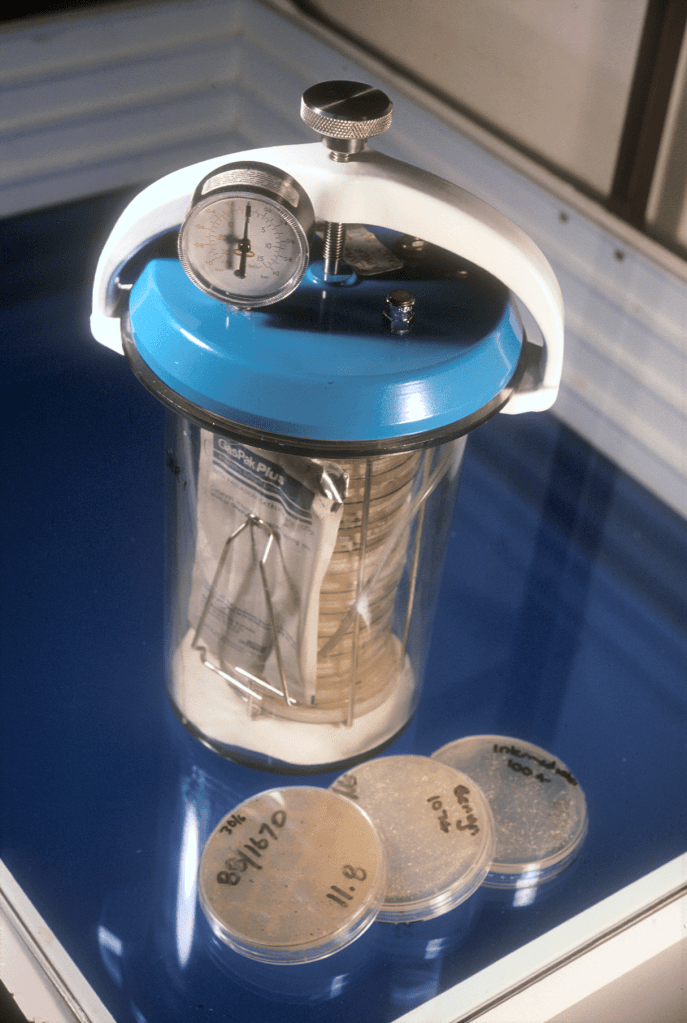 Figure 2. The culture plates are incubated in a sealed jar after removal of oxygen. The culture plates have a layer of solid agar which contains dried sheep hoof. Photo: Ian Links