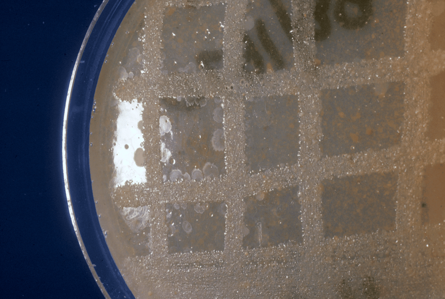 Figure 3. D. nodosus grows on the surface of the agar and becomes visible after about 5 days. It appears as a faint colony that gradually spreads away from the grid line of the inoculum that was applied to the plate. Each colony is shaped like an ear, and the surface of the colony resembles ground glass. Photo: Ian Links