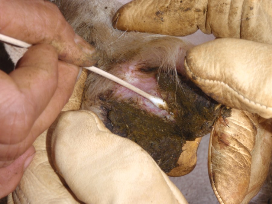 Figure 1. A swab is used to collect a sample from the skin horn junction of an interdigital lesion (Score 1 or 2) (left) or the active margin of underrun lesion (Score 3 or 4) (right) and then used to inoculate a culture plate. Photos: John Egerton
