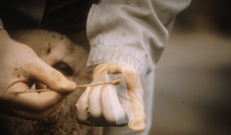 Figure 2. A sample of exudate is taken from the advancing margin of an underrun lesion (Score 3 or 4) using swab stick. The swab can be used to make a smear on a glass slide, inoculate a culture plate or placed into transport medium for later culture, or examined directly using PCR. Photo: John Egerton