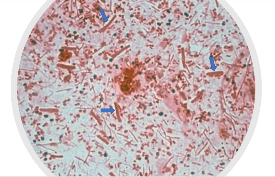 Figure 4. Smear of lesion sample on a glass slide from a case of footrot, stained with Gram. There are a mixture of Gram positive (black) and Gram negative (red) bacteria present. D. nodosus is easily recognised as the largest rod-shaped bacteria in the image (blue arrows). Photo: Richard Whittington